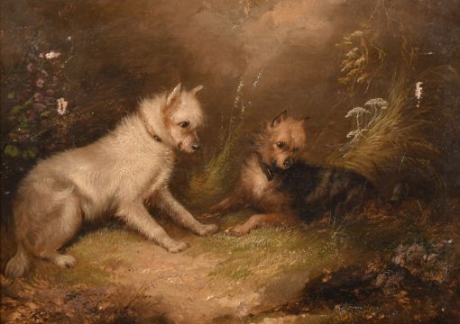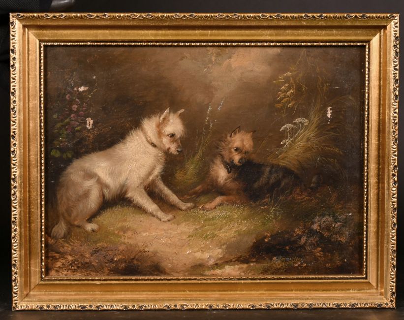 Attributed to George Armfield (1808-1893) British, Two terriers in a landscape, oil on canvas, indistinctly signed, 9" x 12.5".