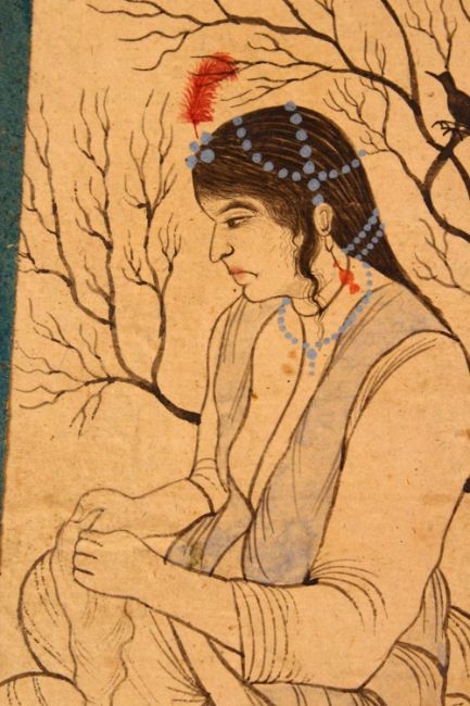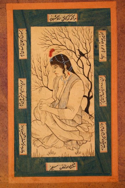 A PERSIAN MINIATURE PAINTING OF A SEATED LADY, 30cm x 20cm.