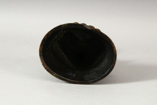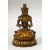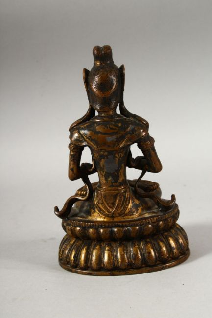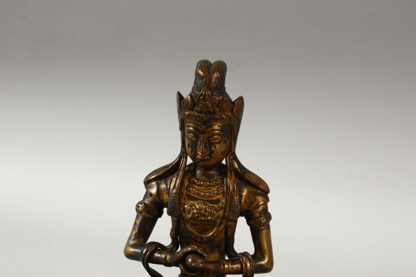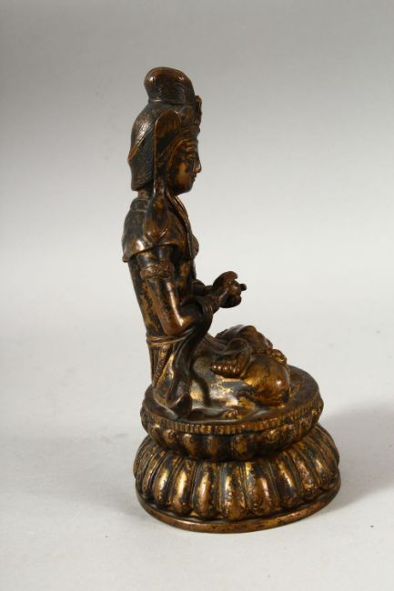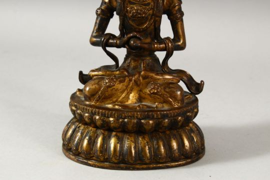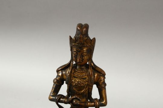 A CHINESE GILT BRONZE FIGURE OF BUDDHA / DEITY - in a seated pose holding a ball, 18cm