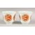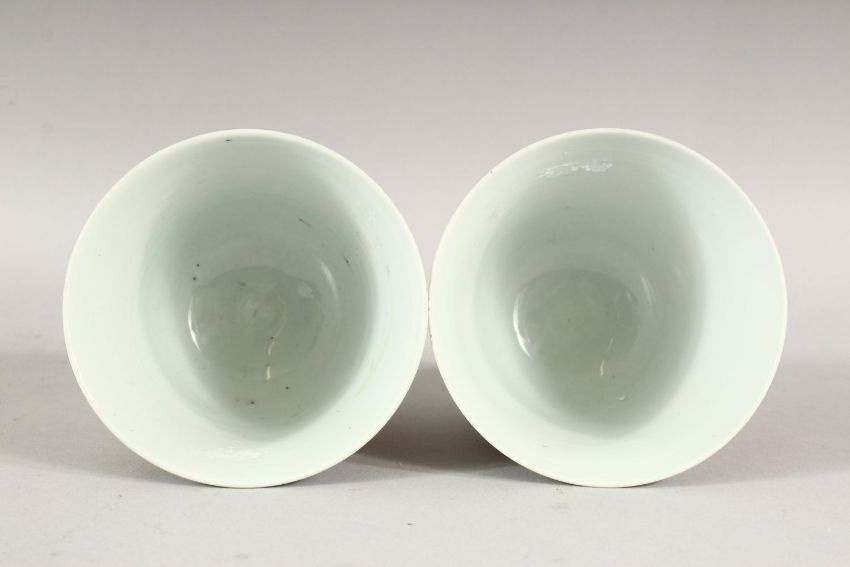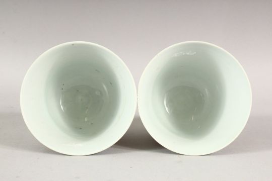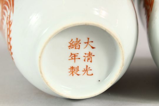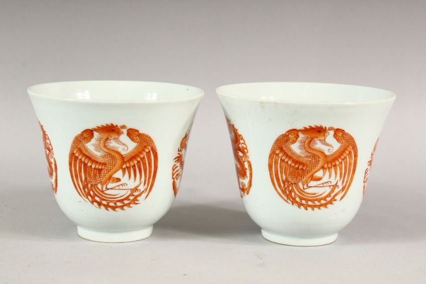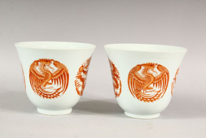 A PAIR OF RED AND WHITE CUPS, each with four panels of dragons and phoenix, 9.5cm high.