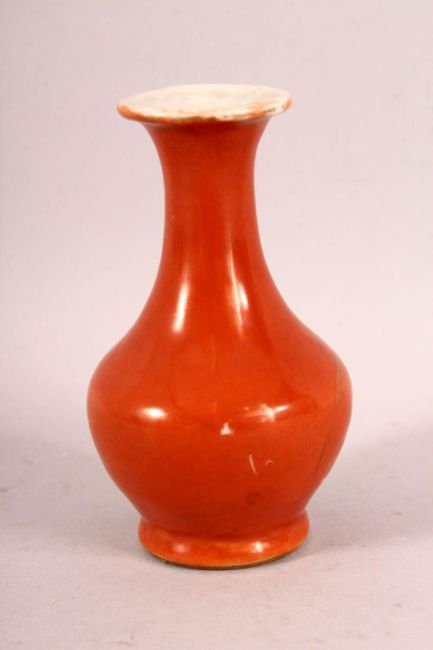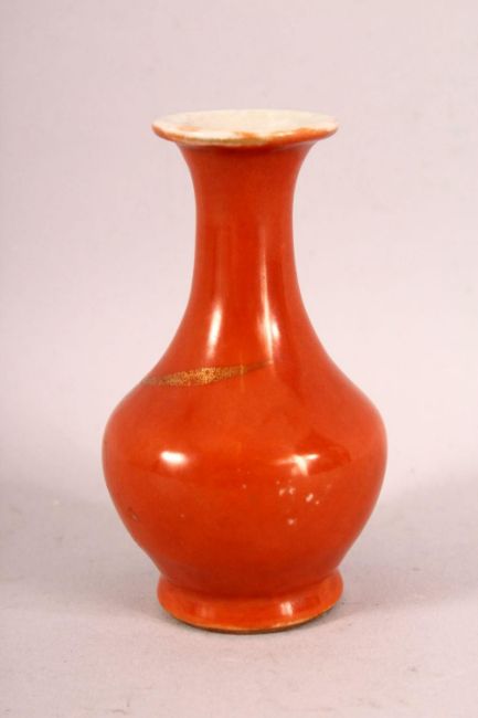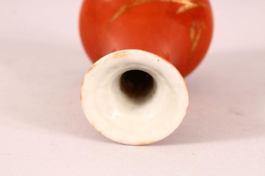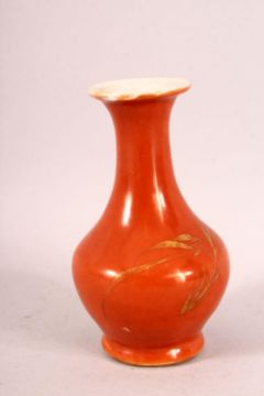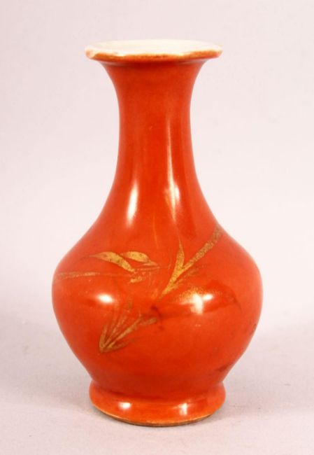 A SMALLER 19TH CENTURY CHINESE CORAL & GILT PORCELAIN BOTTLE VASE, decorated with gilt flora upon coral ground, 9.5cm