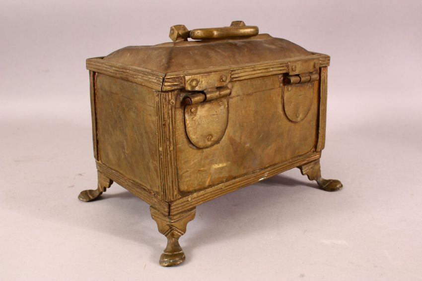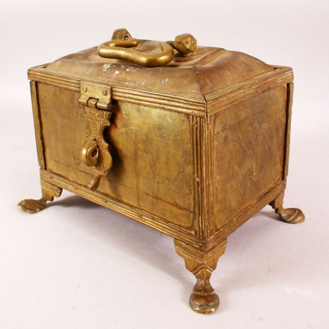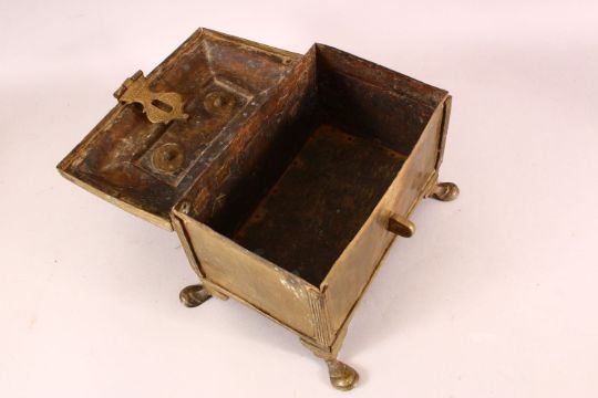 A LARGE 19TH CENTURY INDIAN BASS CASKET, with hinged lid, supported on four legs, 28cm long, 16cm deep.
