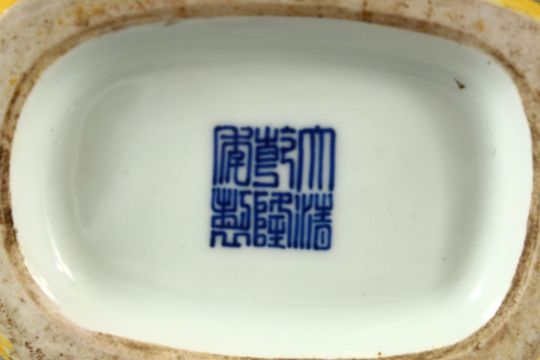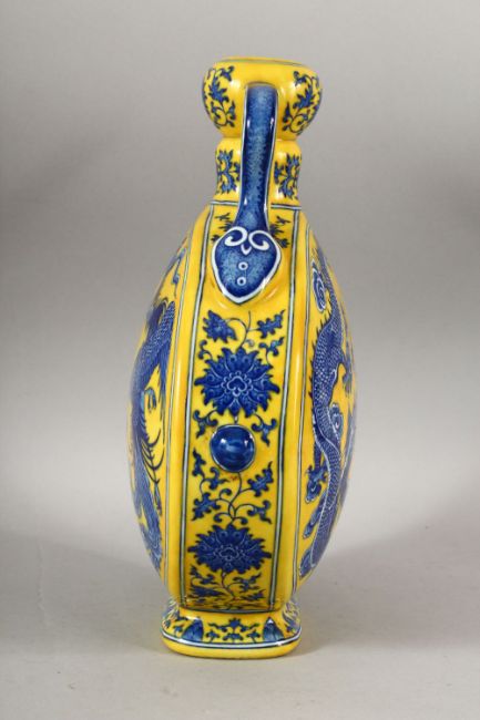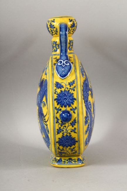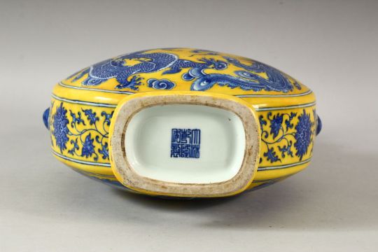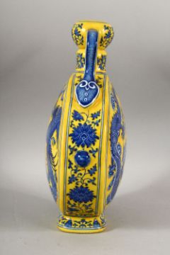 A CHINESE YELLOW GROUND PORCELAIN DRAGON & PHOENIX MOON FLASK - with twin handles, the base with a six character mark, 34cm