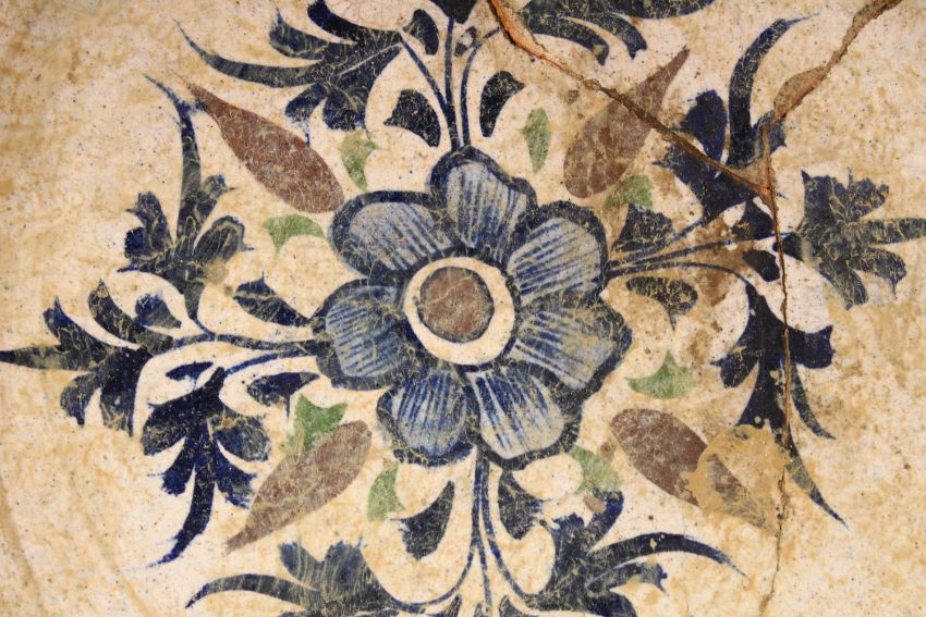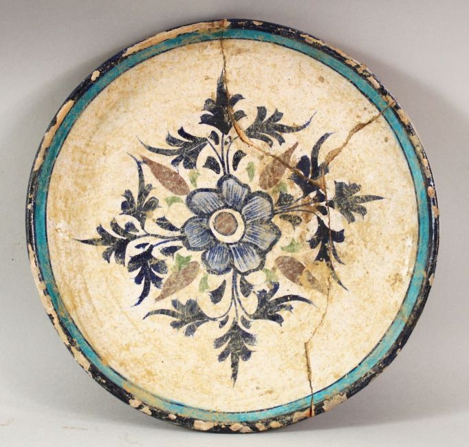 A RARE 16TH CENTURY INDIAN MULTAN POTTERY DISH, the centre painted with a floral spray within a turquoise border, (af), 26cm diameter.