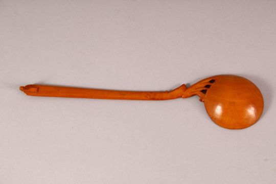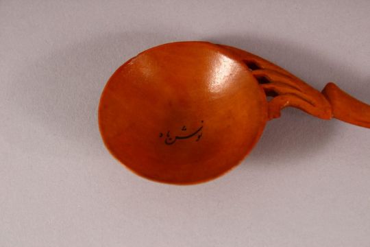 A 19TH CENTURY PERSIAN QAJAR WOODEN SPOON, the bowl and handle with inscription, 21.5cm long.