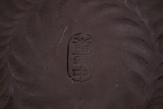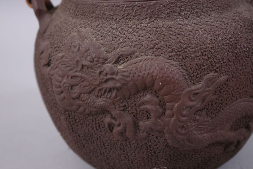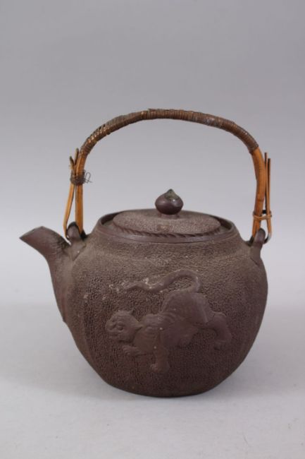 A JAPANESE MEIJI PERIOD MOULDED CLAY / YIXING STYLE DRAGON TEAPOT / KETTLE, the body with nanako style ground with two moulded dragons, the handle formed from wicker, 21cm high x 19cm wide.