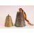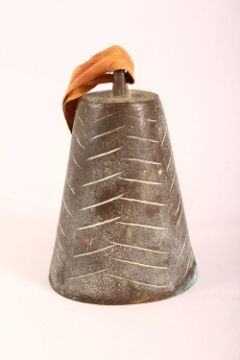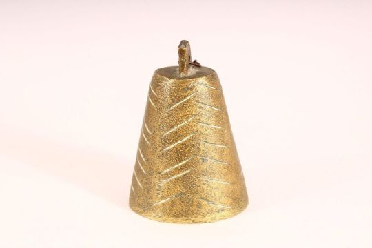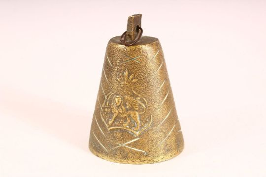 TWO BRONZE QAJAR CATTLE BELLS - each with raised lion decoration one with calligraphy, 11cm & 17cm (2)