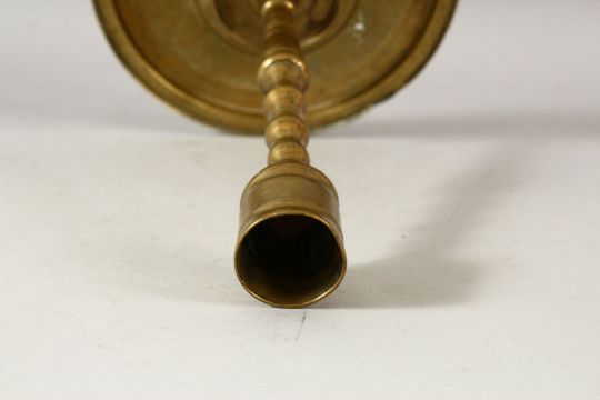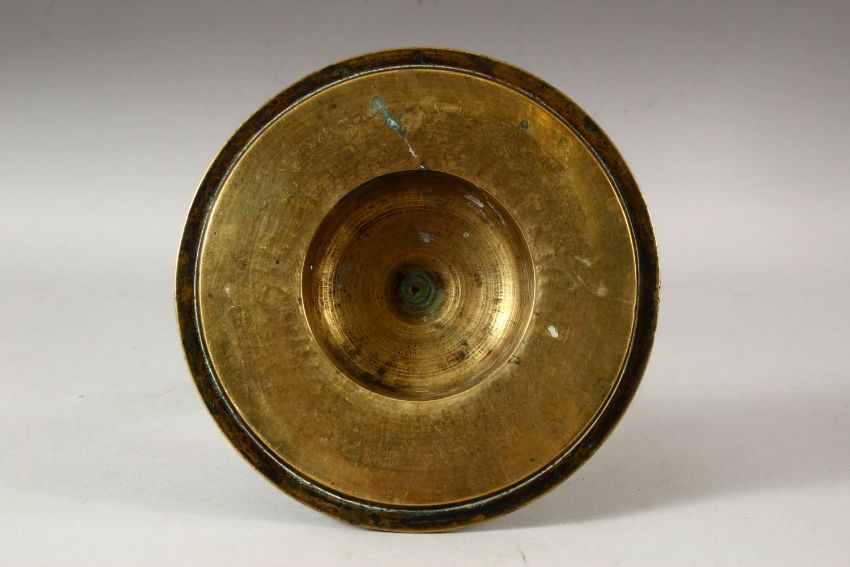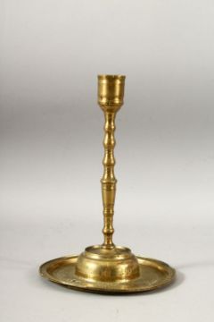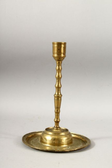 AN 18TH CENTURY OTTOMAN ENGRAVED BRASS CANDLESTICK, the base with a band of calligraphy, 25.5cm.