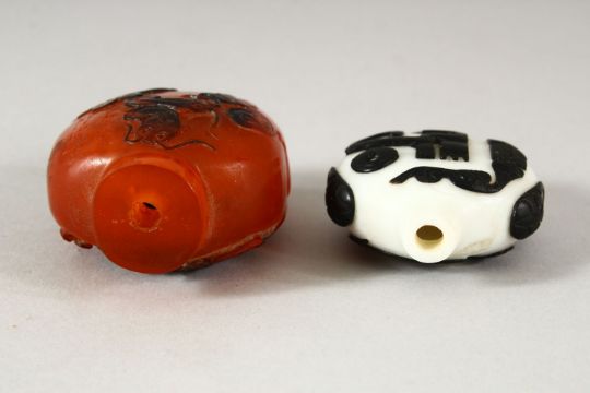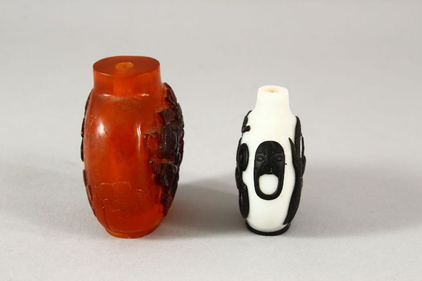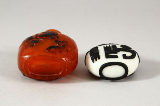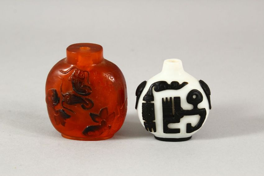 TWO CHINESE SNUFF BOTTLES - one with a white ground with black overlay, the other with carved relief fish and calligraphy, 6cm & 5cm