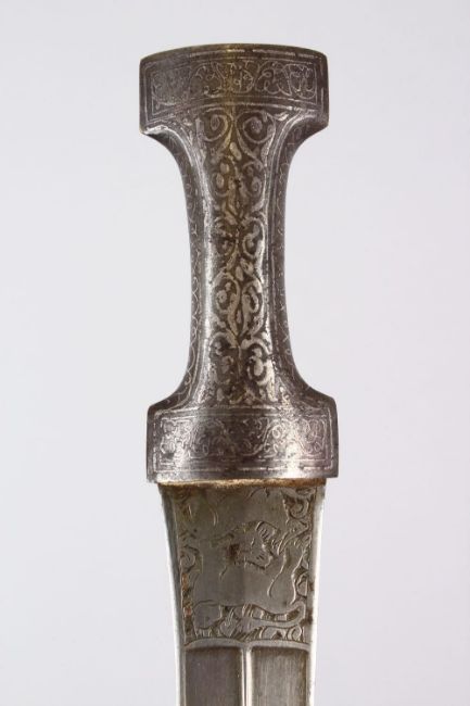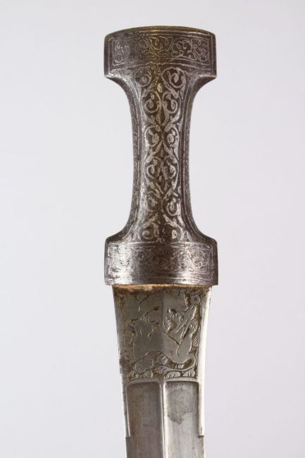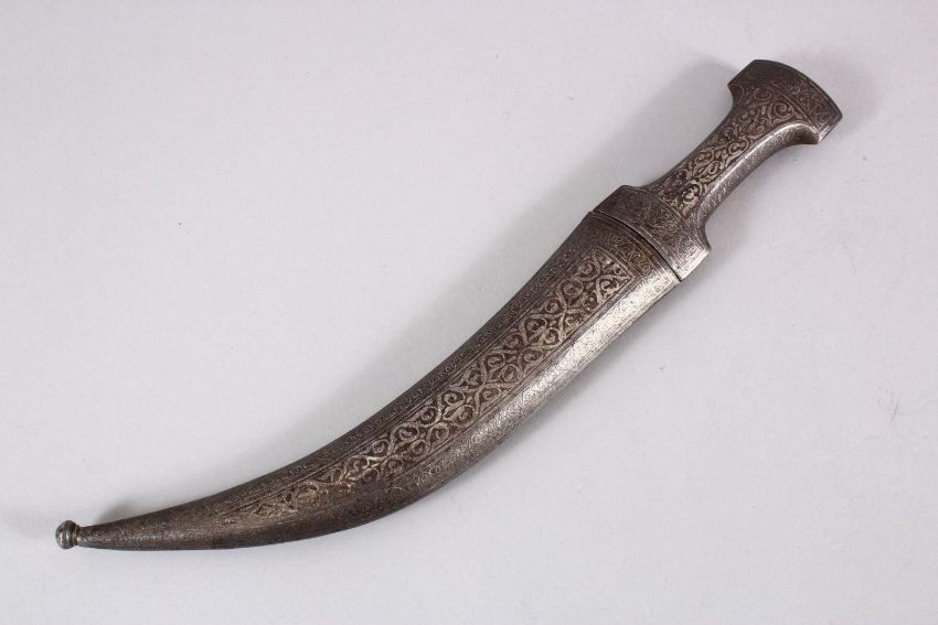 A 19TH CENTURY PERSIAN QAJAR SILVER INLAID STEEL DAGGER with engraved watered steel blade, 35cm long.