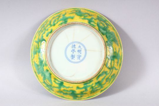 A CHINESE YELLOW GROUND PORCELAIN DRAGON DISH, the base with six character mark, 20cm diameter.