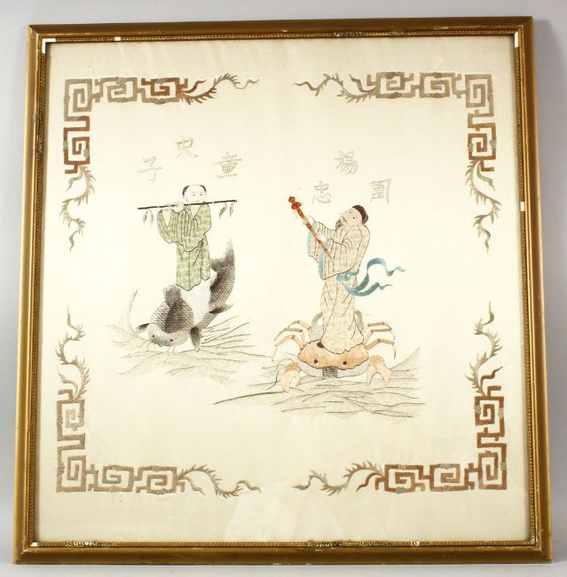 A CHINESE SILK EMBROIDERED PICTURE, depicting two male musicians, one standing on a crab, the other on a fish, 54cm x 51cm.