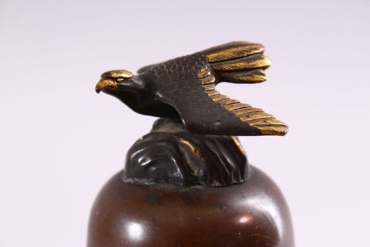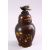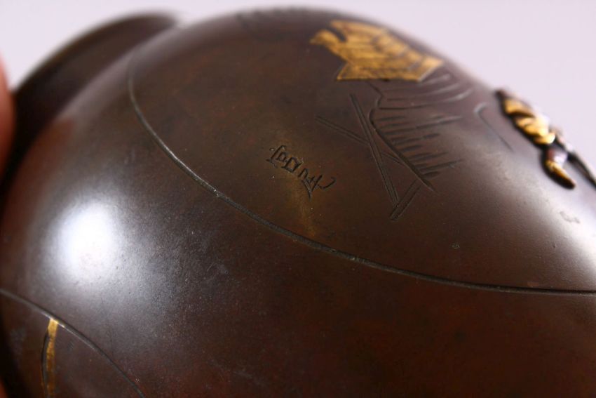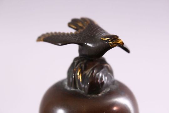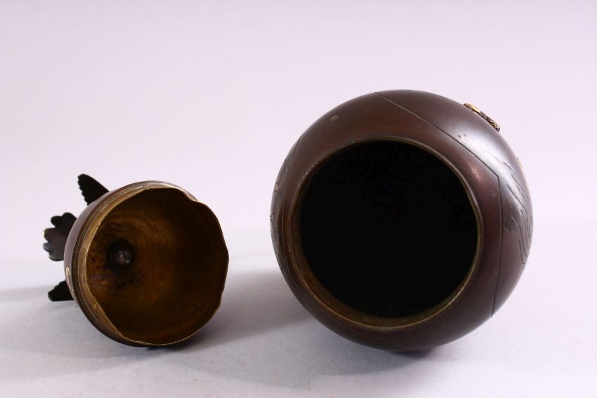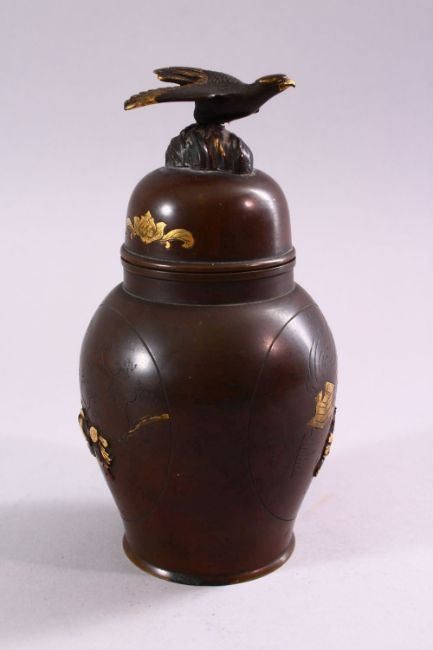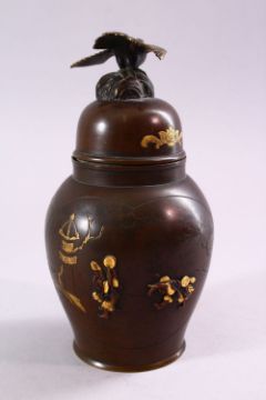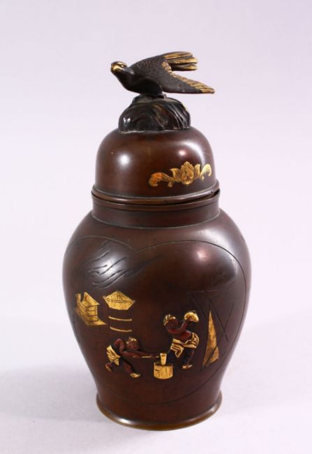 A JAPANESE MEIJI PERIOD BRONZE & MIXED METAL VASE & COVER, the body of the vase with mixed metal inlaid and onlaid decoration depicting dancing and working figures, with inlaid and chased details, the top with the finial of a bird, 6cm high.