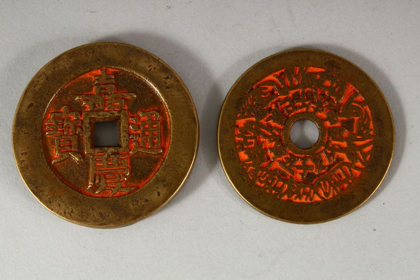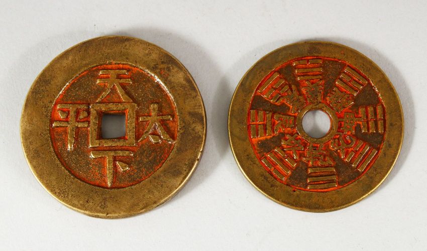 TWO CHINESE CURRENCY COINS - with residual poly chrome decorations 5.6cm & 6cm