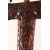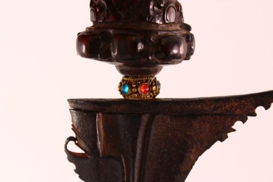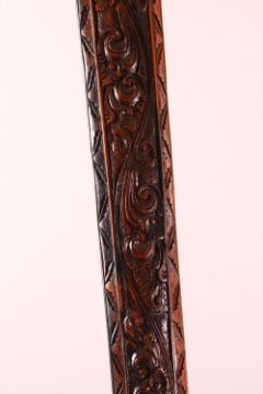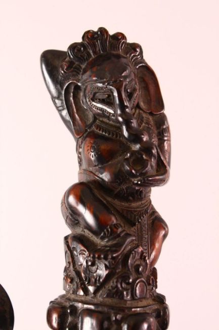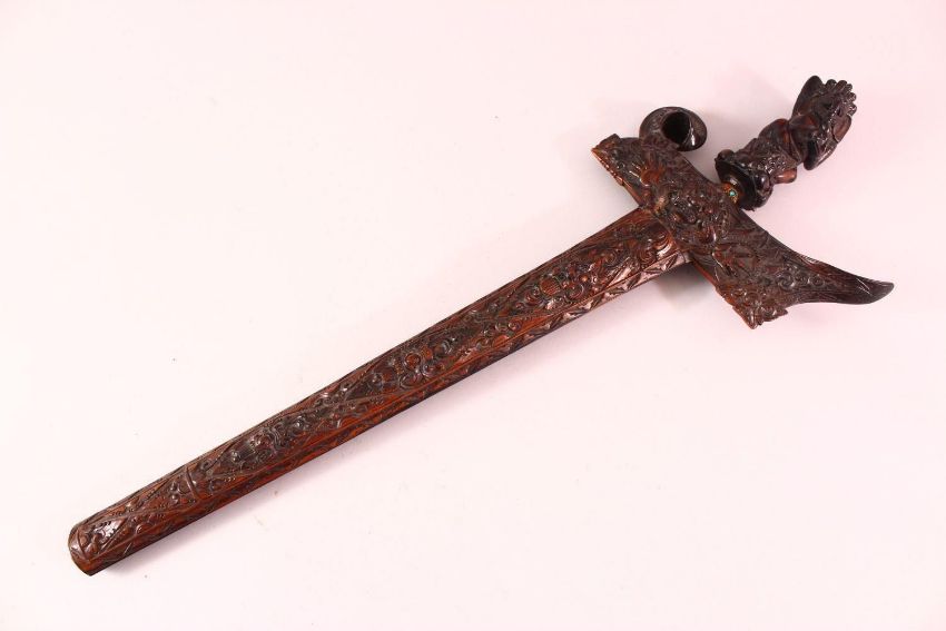 A GOOD INDONESIAN CARVED WOODEN SWORD / DAGGER, the well carved dagger with an elephant carved deity handle, metal inlaid collar, with carved mythical beast sheath, the balde of waved form, 62cm