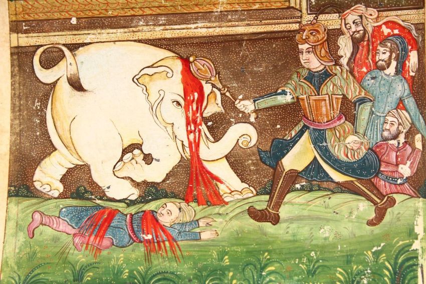 A 19TH CENTURY PERSIAN PAINTING OF RUSTAM KILLING THE WHITE ELEPHANT, the verso with manuscript, unframed, 21cm x 15.5cm.