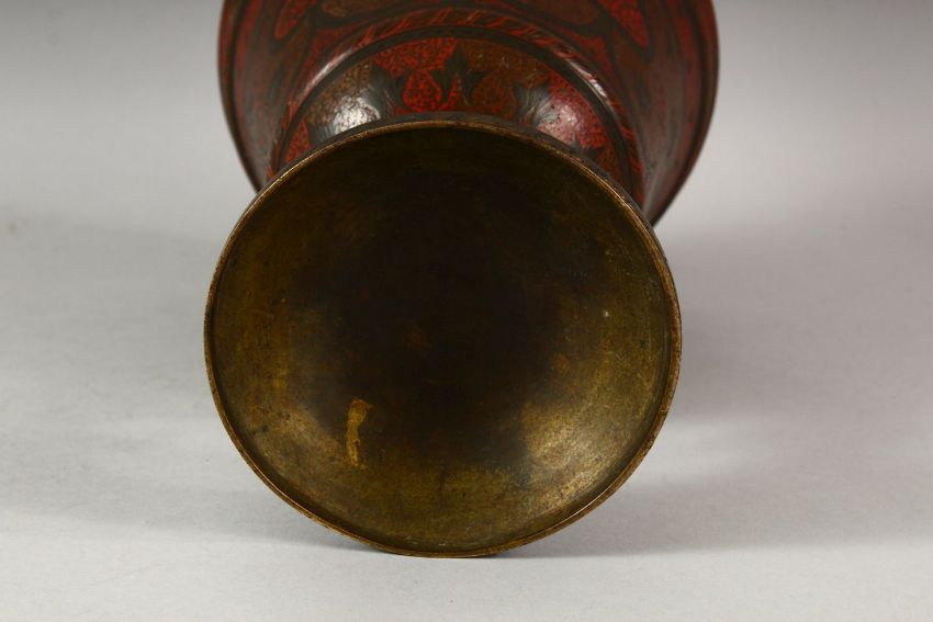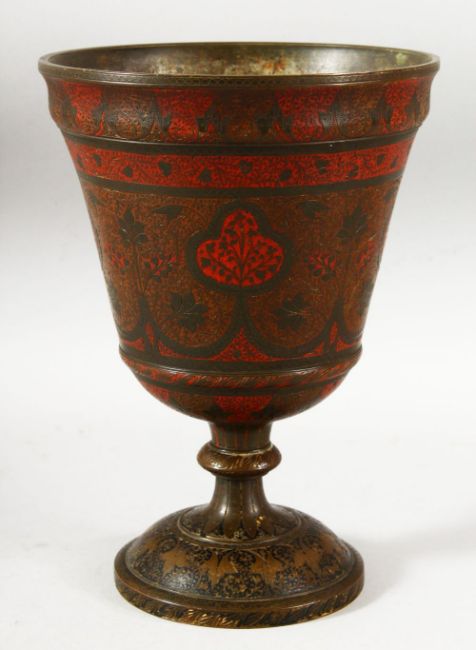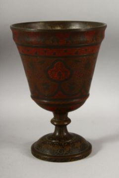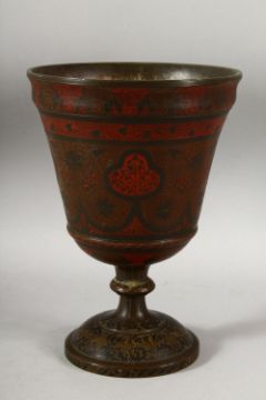 A LARGE 19TH CENTURY INDIAN / KASHMIR BRONZE TEMPLE CUP, with chased decoration and areas painted or possibly enamelled in red, 26.5cm high.
