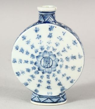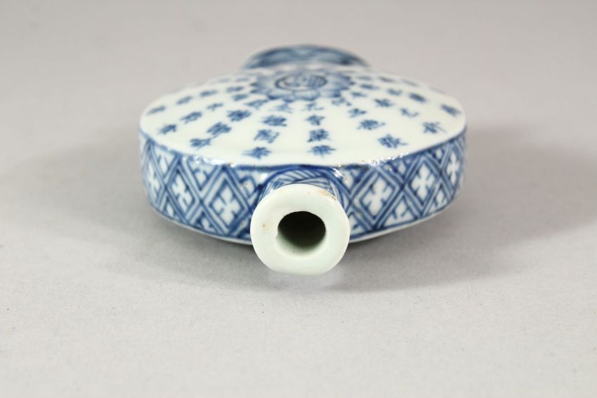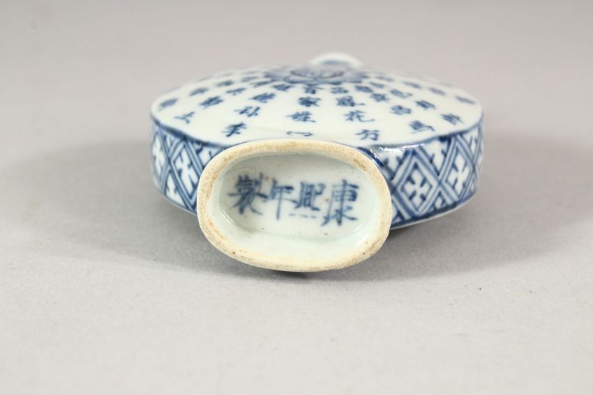 A GOOD CHINESE BLUE & WHITE " MOONFLASK" FORM PORCELAIN SNUFF BOTTLE - The base with a four character mark, 8.5cm high.
