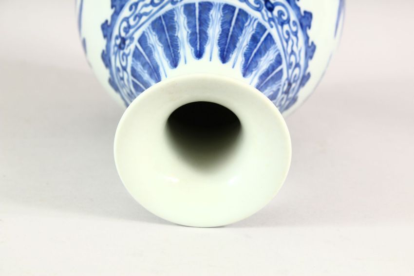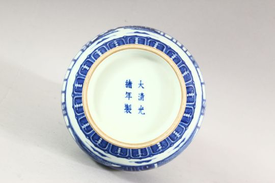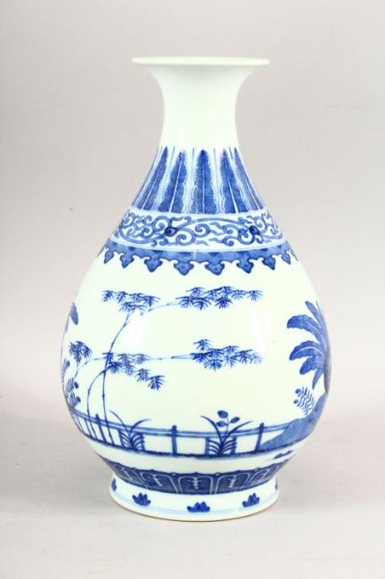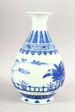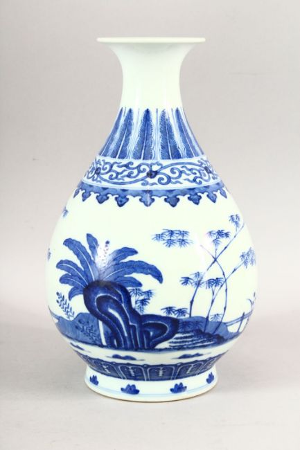 A CHINESE BLUE AND WHITE BULBOUS VASE, decorated with bamboo, six character mark to base, 26cm high.