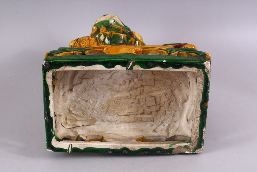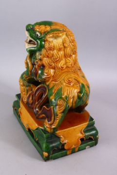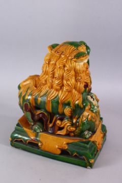 A GOOD CHINESE SANCAI GLAZED POTTERY FIGURE OF A LION DOG, the dog with its paws upon a pup, playing, possibly 19th century, 38cm high x 30cm wide.