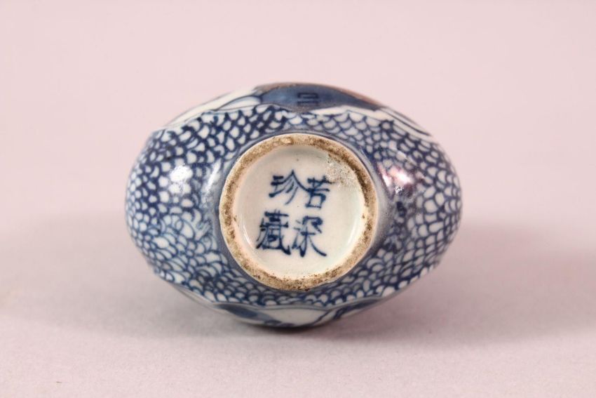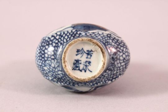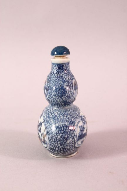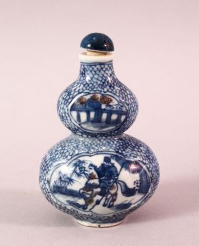A CHINESE BLUE AND WHITE GOURD SHAPED PORCELAIN SNUFF BOTTLE, painted to each side