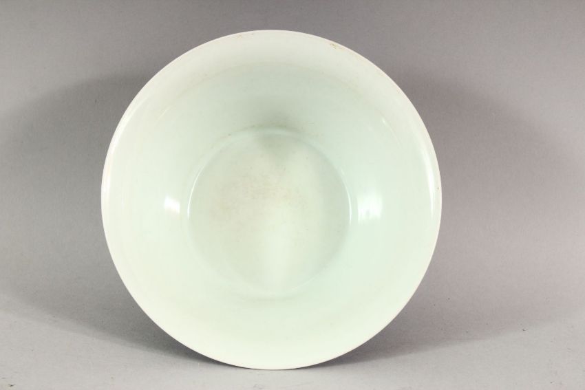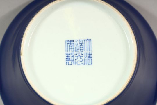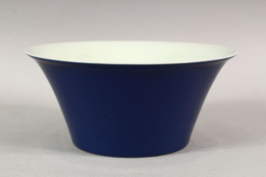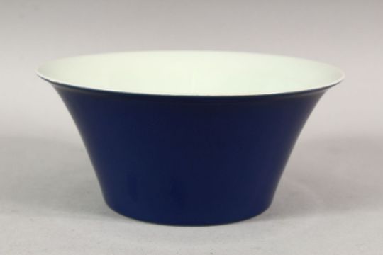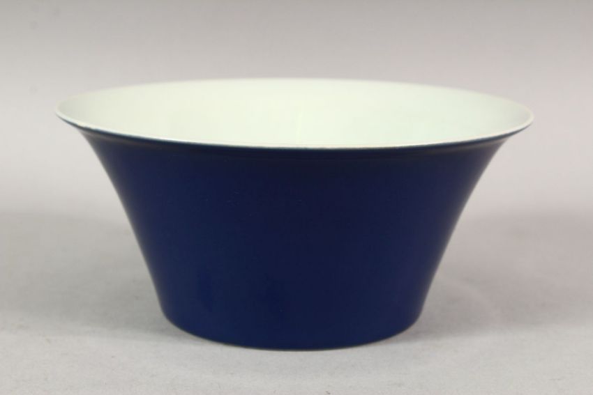A GOOD CHINESE BLUE GLAZED BOWL with white interior, six character mark in blue, 15cm diameter.