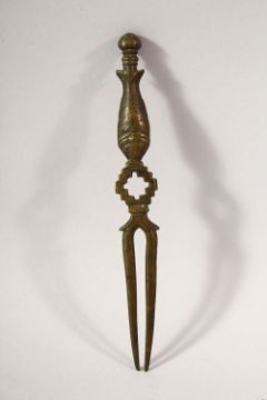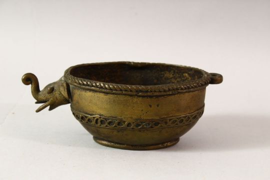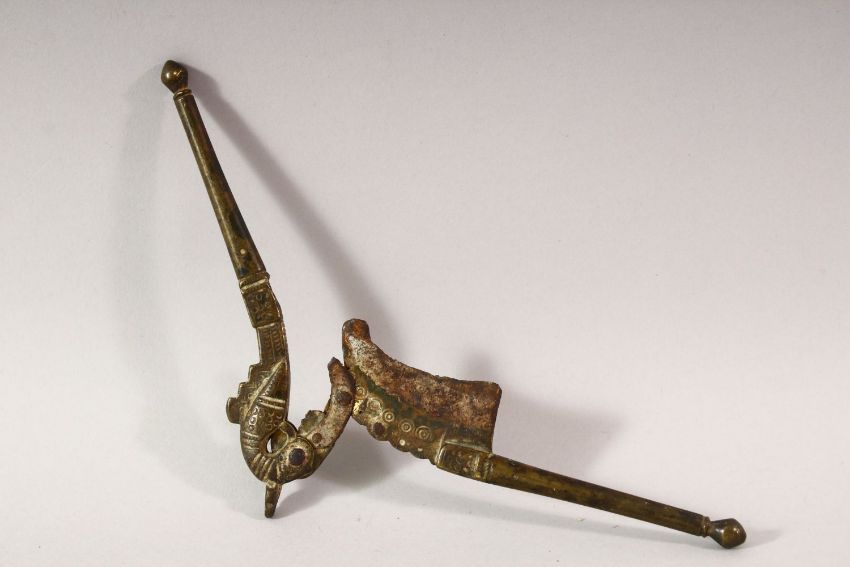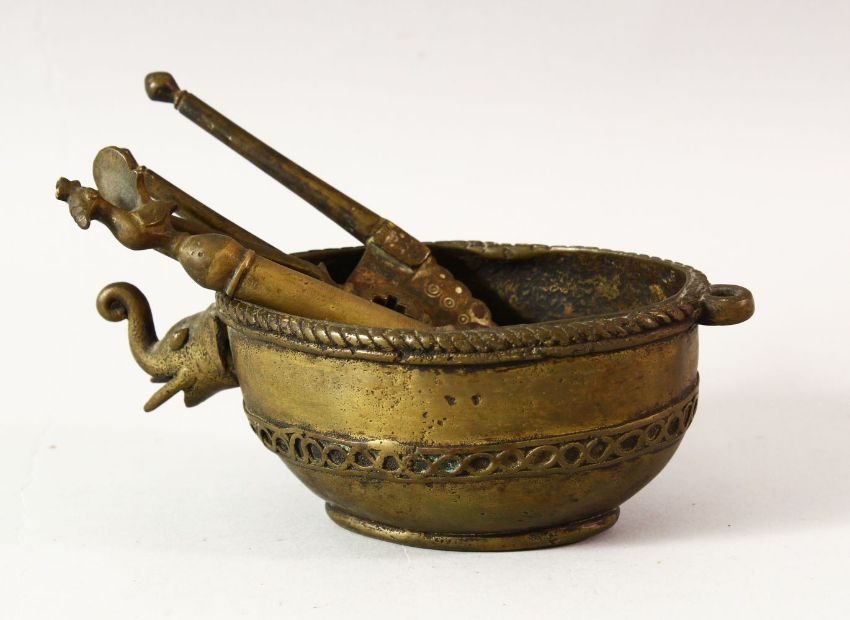 AN EASTERN BRONZE POURING VESSEL, the spout modelled as the head of an elephant, together with a pessel with cockeral finial, a pair of betel nut cutters and a folk, vessel 18cm long.