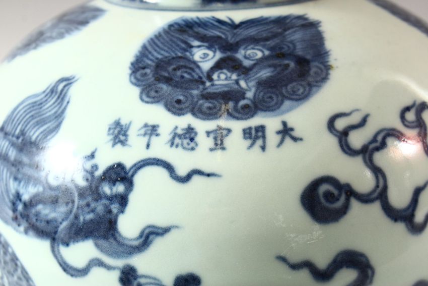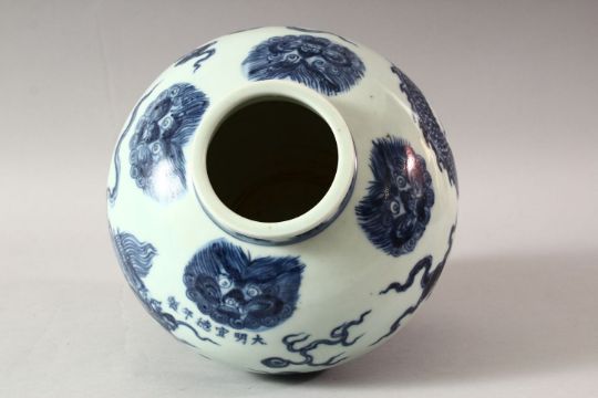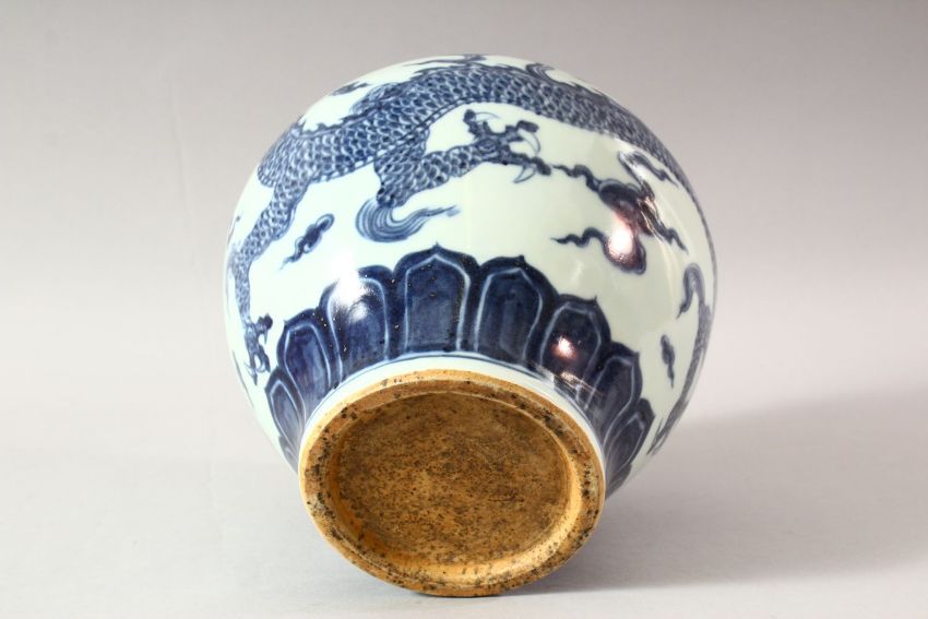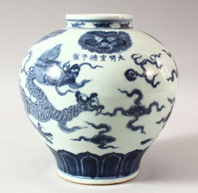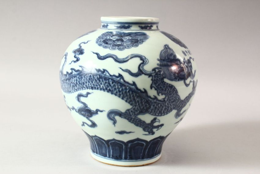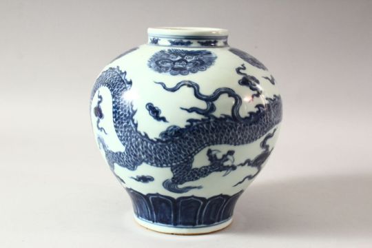 A CHINESE MING STYLE BLUE AND WHITE DRAGON JAR, decorated with a dragon chasing the flaming pearl of wisdom amongst stylised clouds, 21cm high.