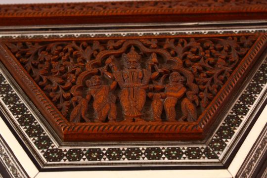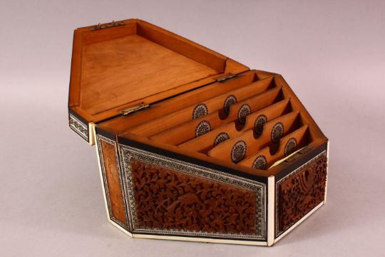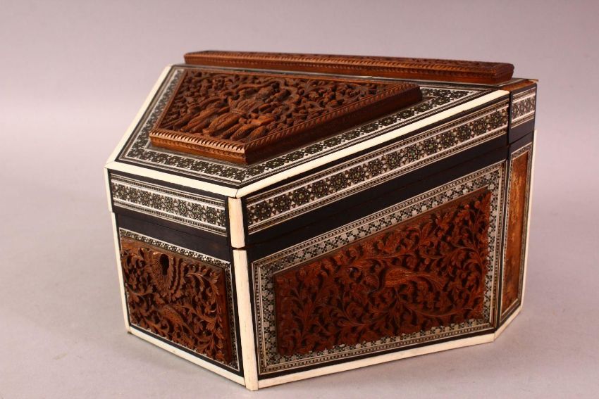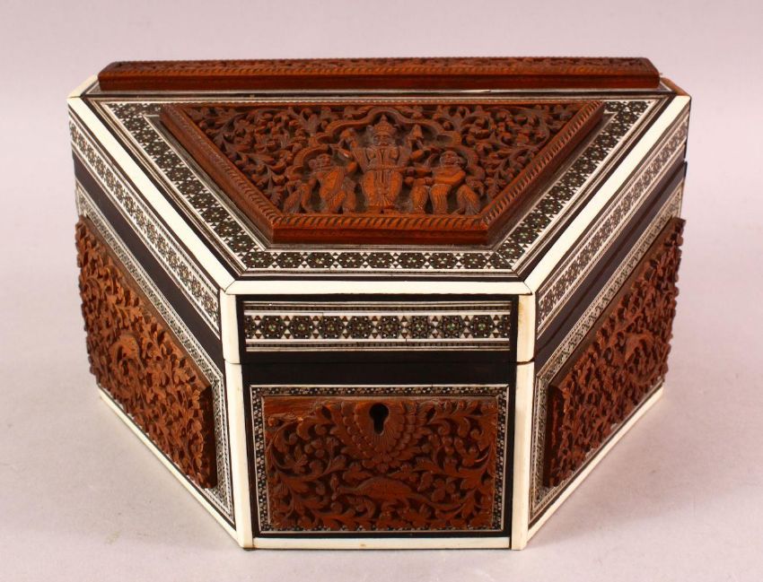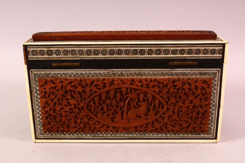 AN INDIAN CARVED WOOD & INLAID IVORY & EBONY LIDDED BOX, carved with figures and birds amongst foliage, 24cm x 15cm `