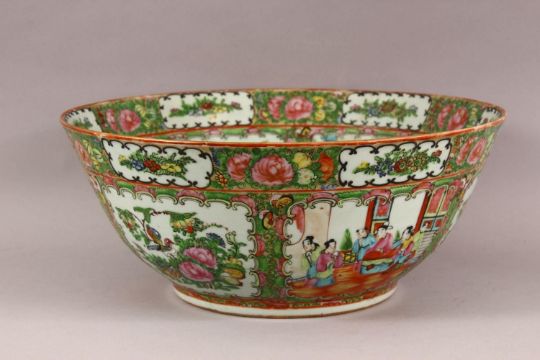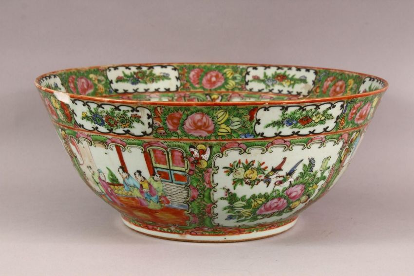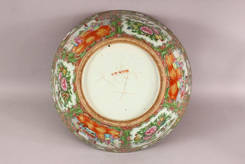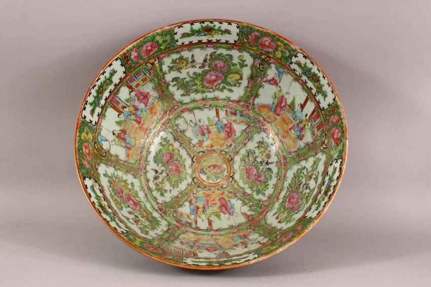 A LARGE 19TH CENTURY CHINESE CANTON FAMILLE ROSE PORCELAIN BOWL - with panel decoration of figures, flora, birds and butterflies, 36.5cm