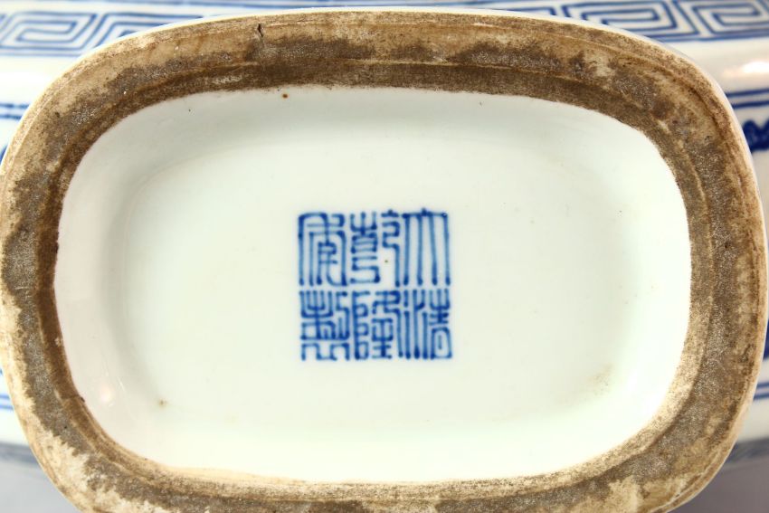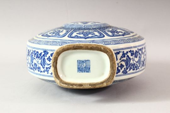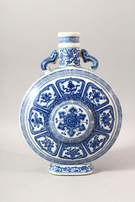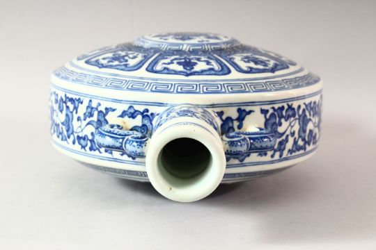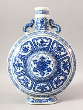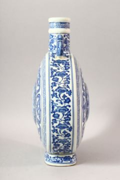 A CHINESE BLUE AND WHITE PORCELAIN TWIN HANDLE MOONFLASK, decorated with the eight treasures pattern, 34.5cm high.