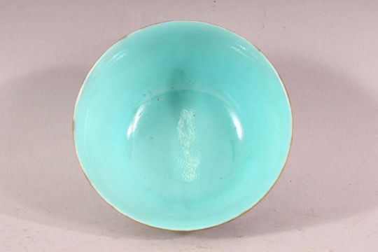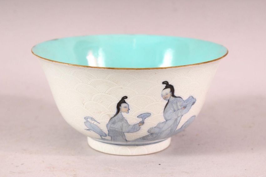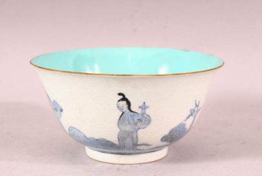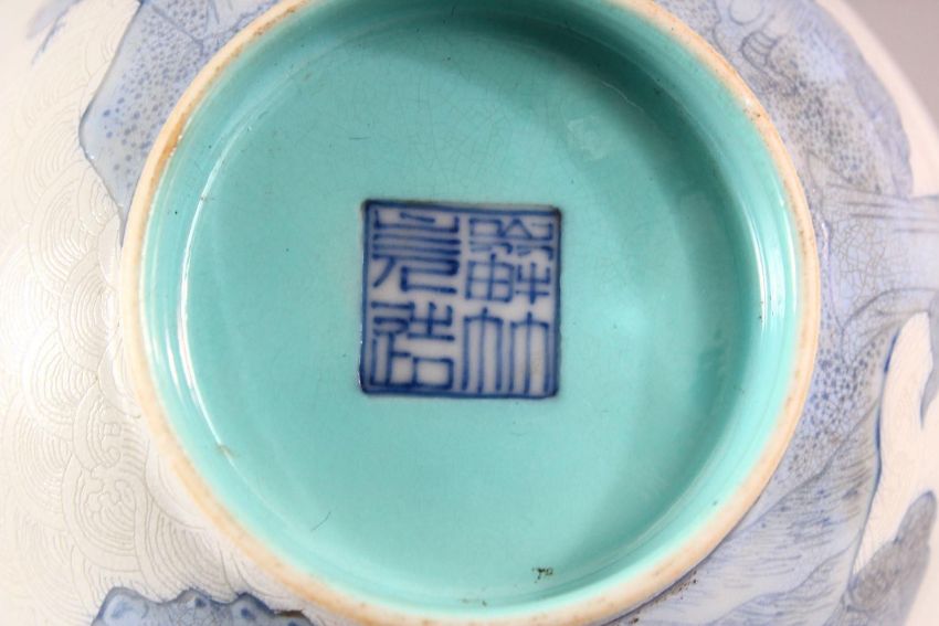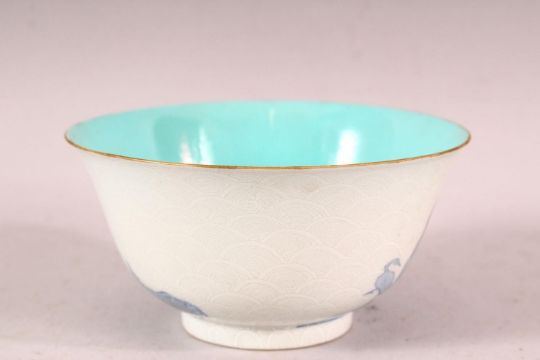 A CHINESE BLUE, WHITE AND TURQUOISE PORCELAIN TEA BOWL, the sides with incised scale ground and painted with translucent blue figures, the base with four character mark, 11cm diameter.
