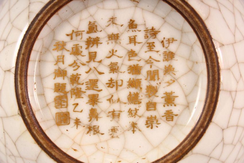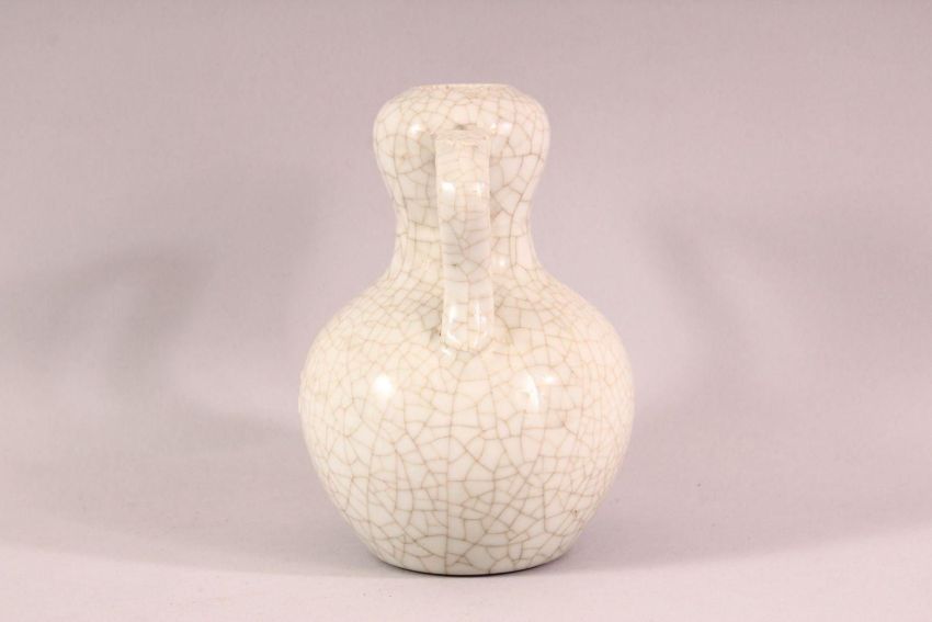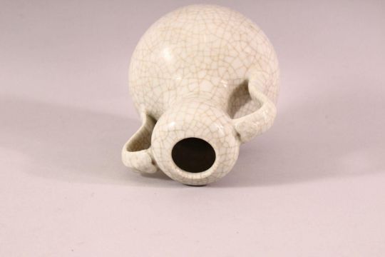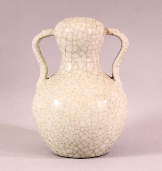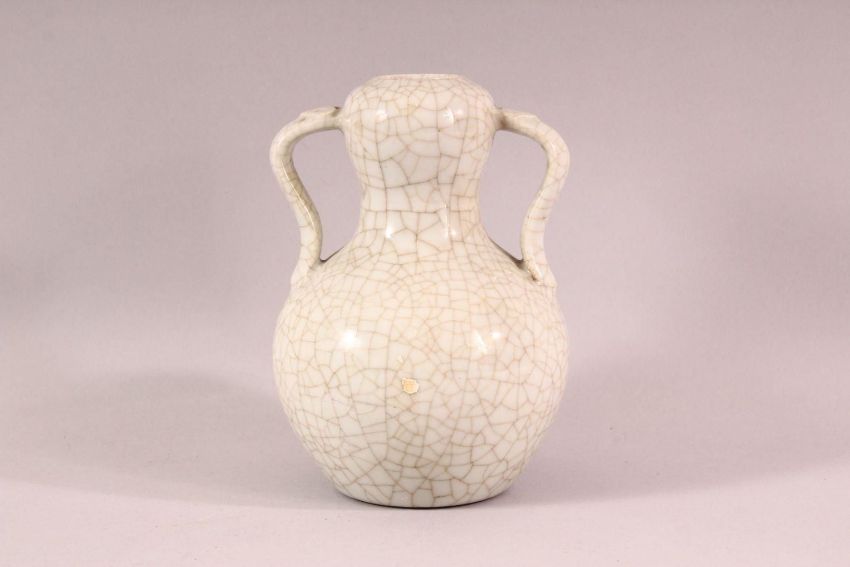 A CHINESE CRACKLE GLAZED PORCELAIN TWIN HANDLE VASE, the base with gilt calligraphy, 19cm high