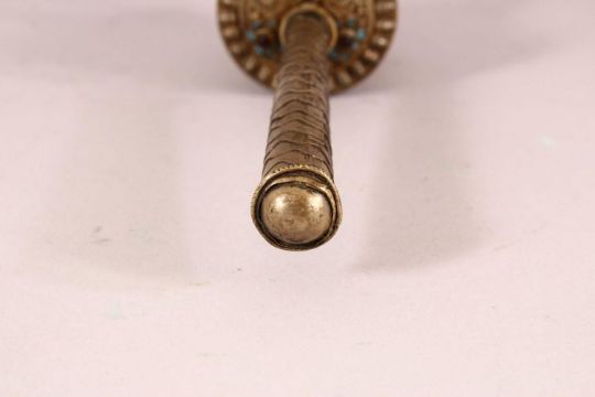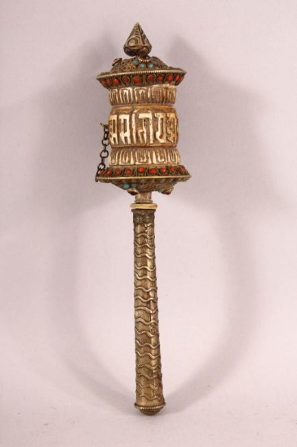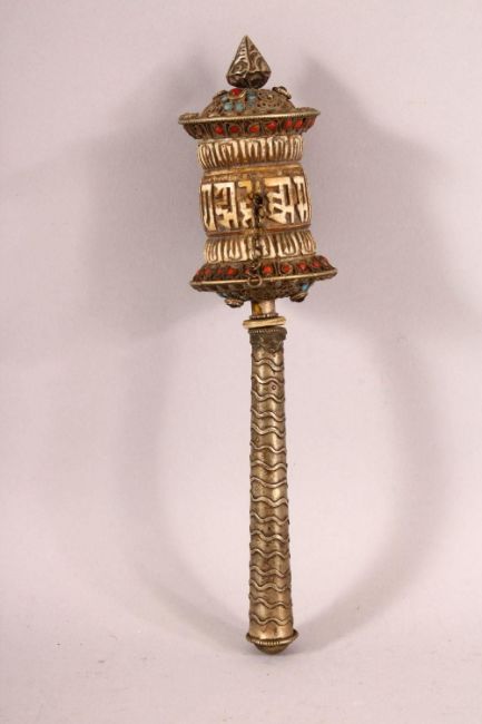 A 19TH CENTURY TIBETAN CARVED BONE AND WHITE METAL PRAYER WHEEL - with carved bone core with script inlaid with coral and turquoise stones, containing its script interior, 22cm