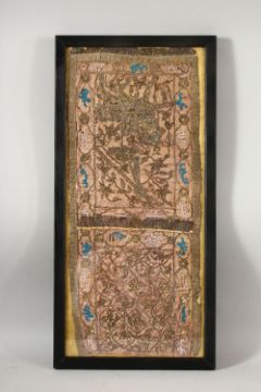 A FINE PAIR OF 18TH CENTURY NORTH INDIAN METAL THREADED BEADED SILK PANELS, framed and glazed, each 58cm x 28cm.