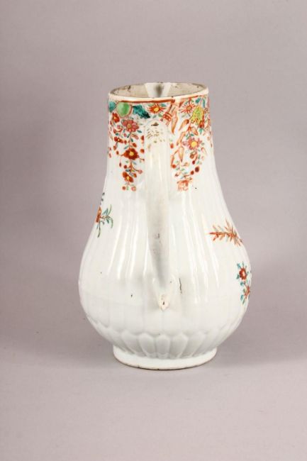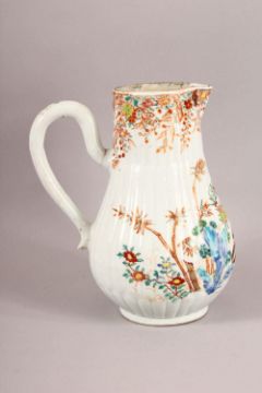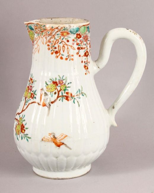 AN 18TH CENTURY CHINESE FAMILLE ROSE PORCELAIN RIBBED BEAK JUG - decorated with birds in branches, 21.5cm high