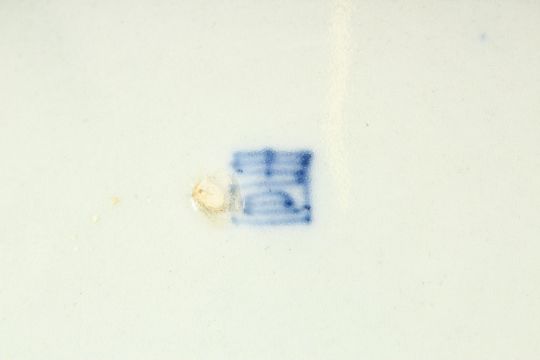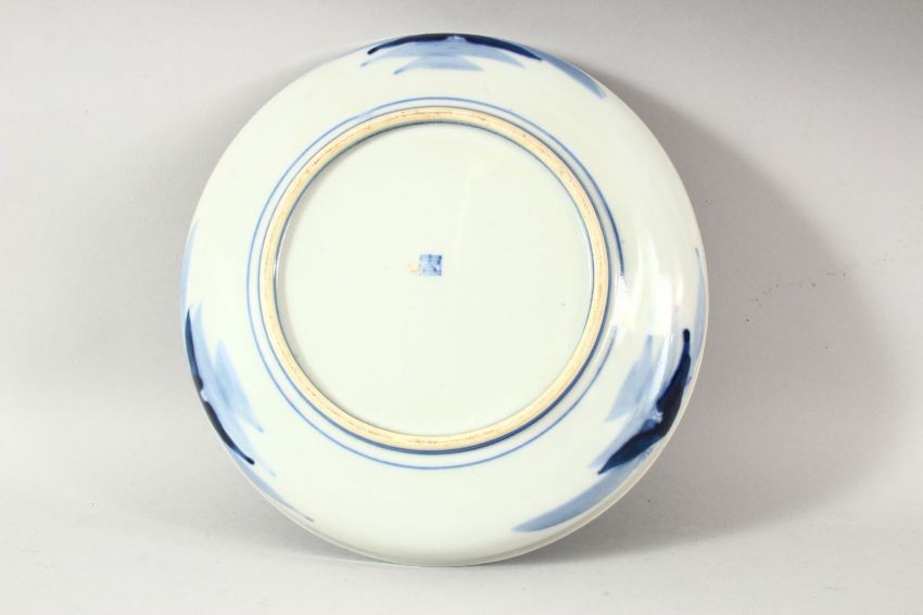 A JAPANESE BLUE AND WHITE PORCELAIN DISH, painted with a figure in a vast landscape, mark to base, 26cm diameter.