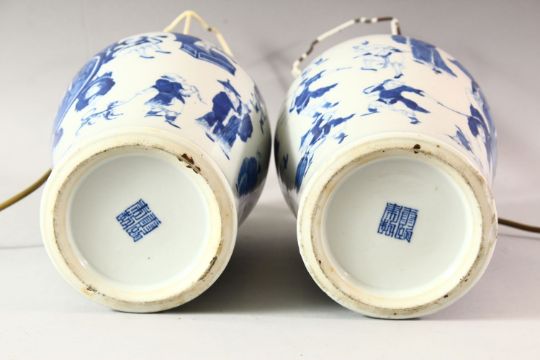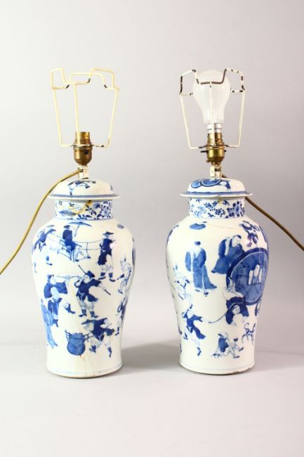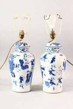 A PAIR OF CHINESE BLUE AND WHITE PORCELAIN JARS AND COVERS converted to lamps, both decorated with various figures, (af), overall height of each approx. 50cm high.