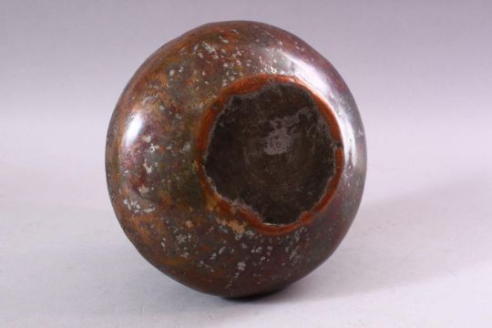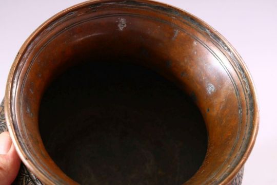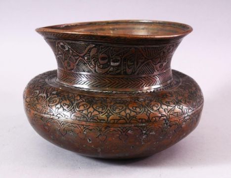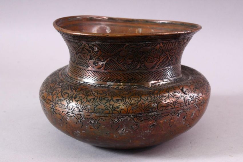A 17TH CENTURY INDIAN TINNED COPPER SPITTOON, with engraved neck and shoulder, 19cm diameter, 13cm high.