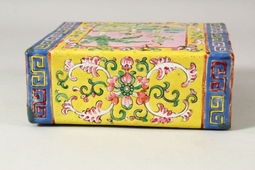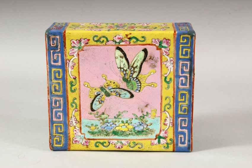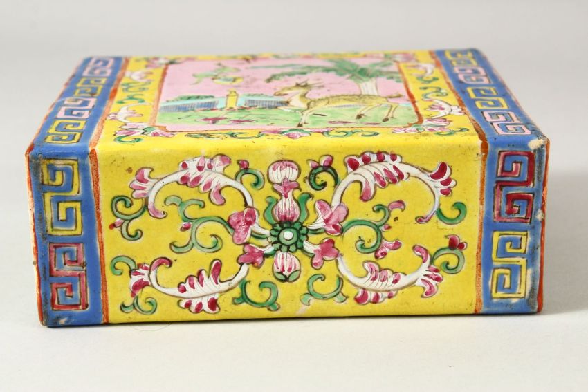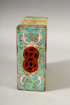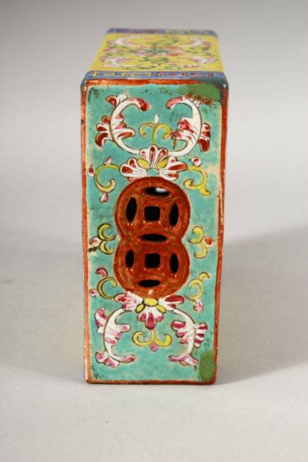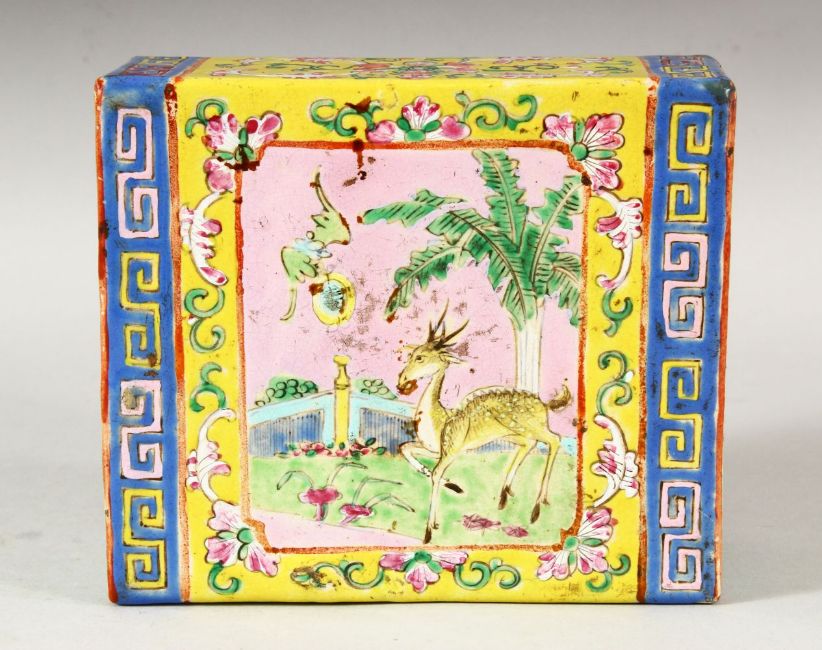 A CHINESE FAMILLE ROSE / JAUNE PORCELAIN PILLOW, with pierced ends, decorated with two panels of deer and butterflies, 16cm x 13.5cm.