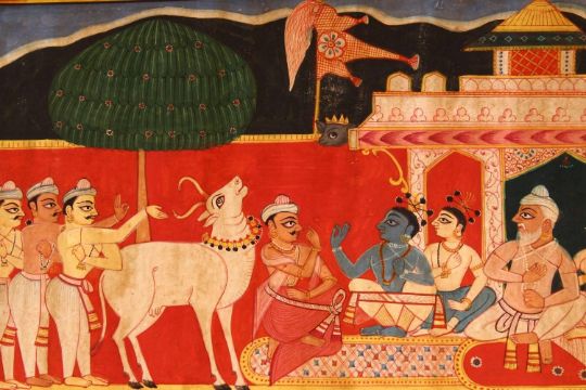 A GOOD INDIAN MINIATURE PAINTING, depicting a courtyard scene with figures and a cow, unframed, 28cm x 21cm.