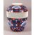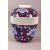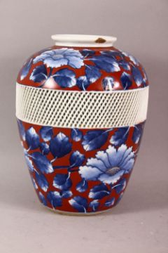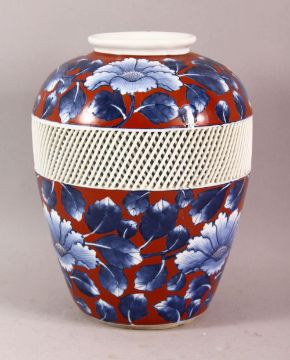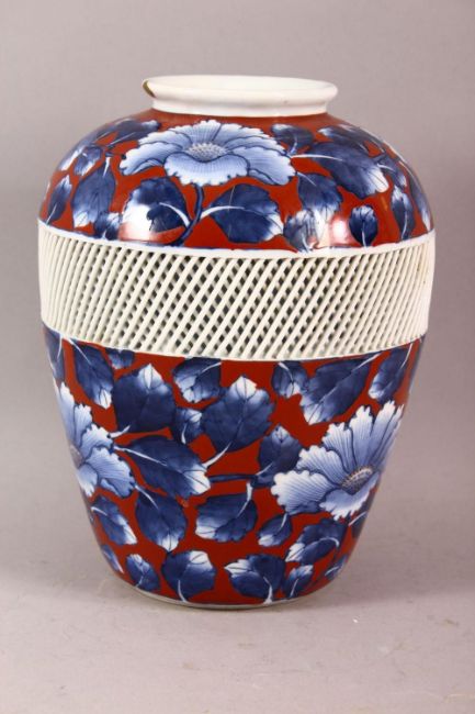 A JAPANESE BLUE AND RED PORCELAIN VASE, the body with a reticulated band around the centre and painted with flowers containing small gilt highlights, the base with mark, 21.5cm high.