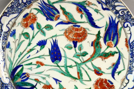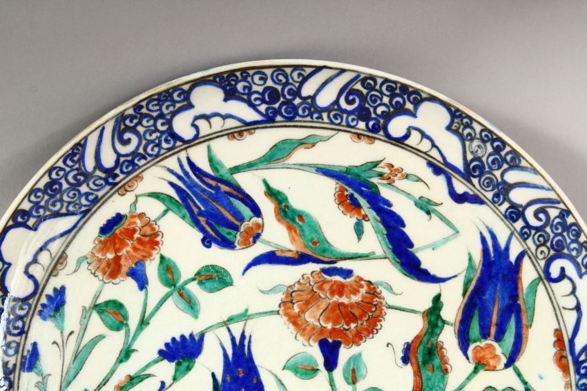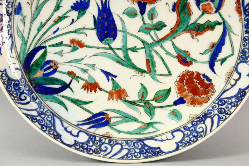 A TURKISH IZNIK POTTERY PLATE - decorated with scenes of native floral motif decorations, 33cm