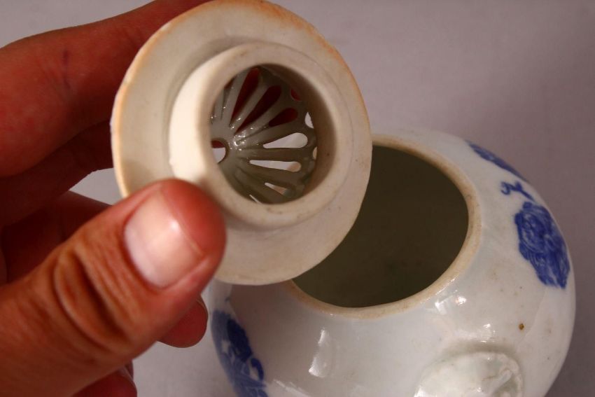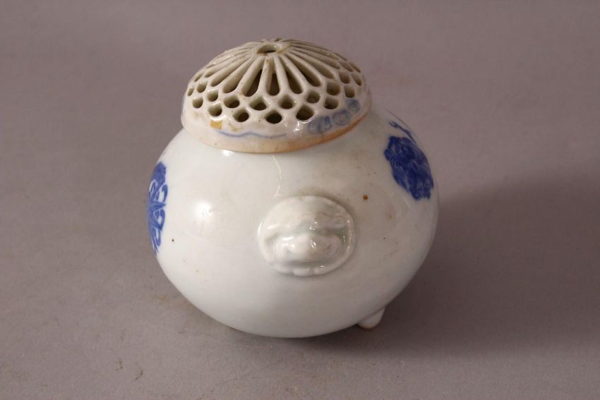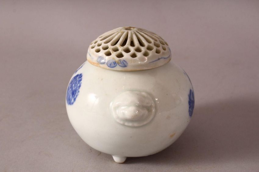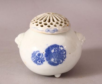 A JAPANESE MEIJI PERIOD HIRADO PORCELAIN BLUE & WHITE KORO & COVER - the body of the koro decorated with floral decoration with an openwork chrysanthemum formed cover and twin handles - 10cm diameter .