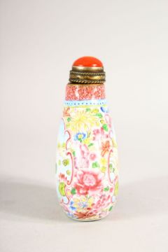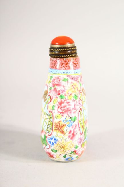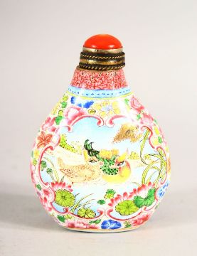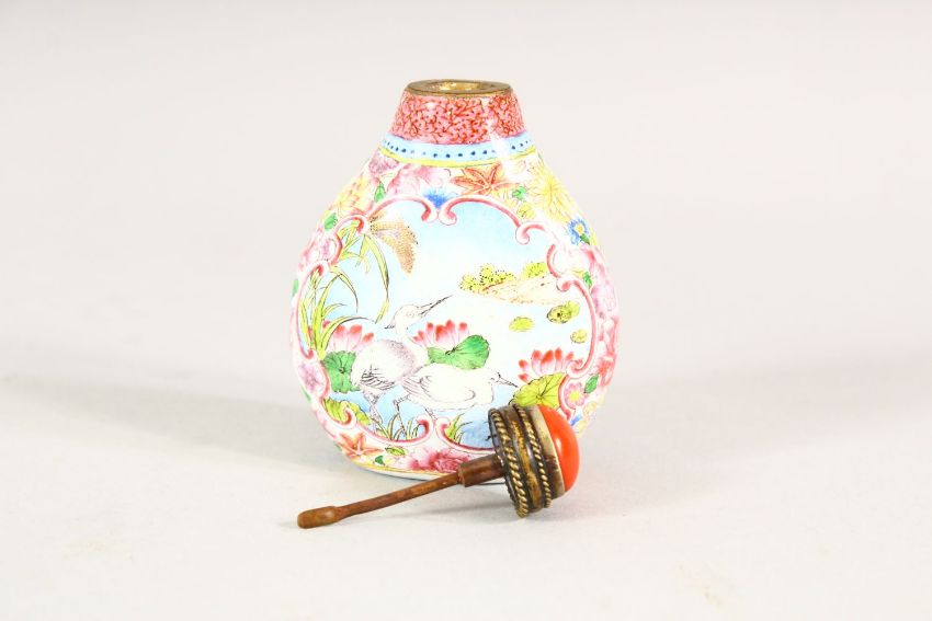 A CHINESE ENAMEL SNUFF BOTTLE and hardstone stopper, painted with panels of birds, 8cm high.