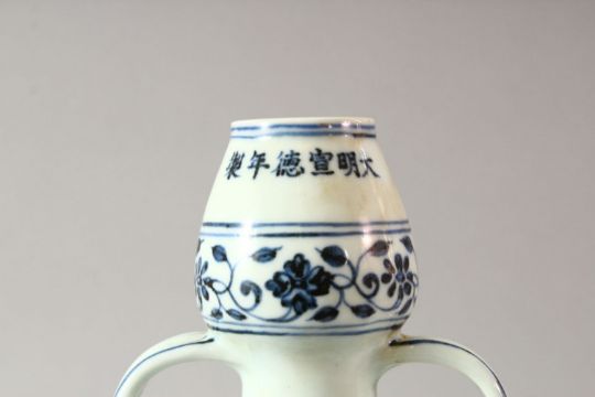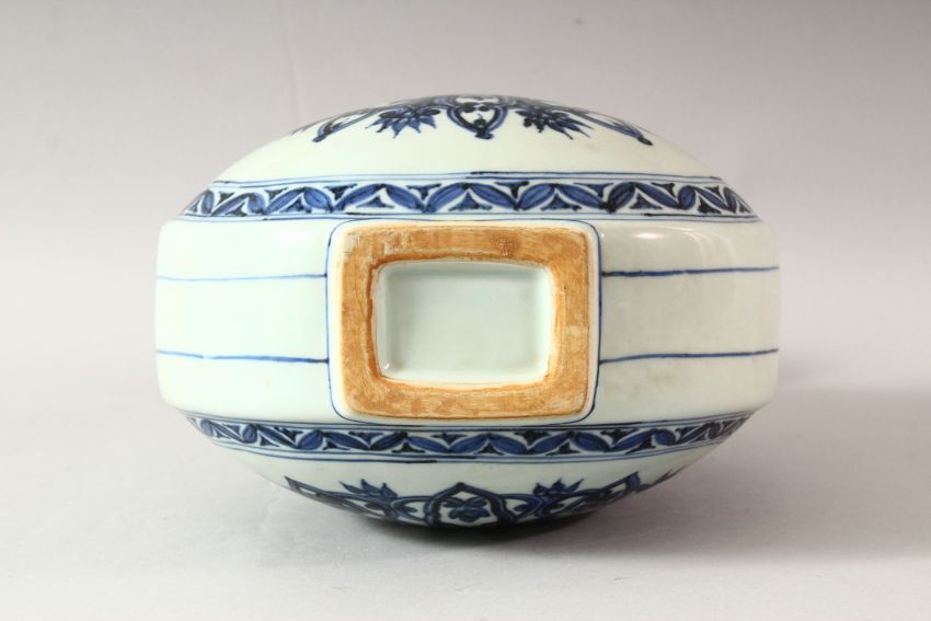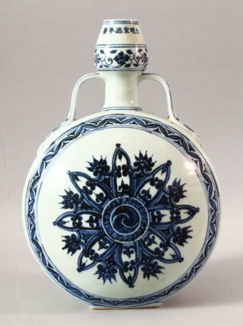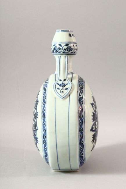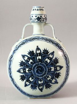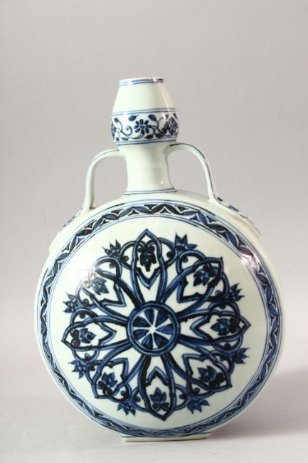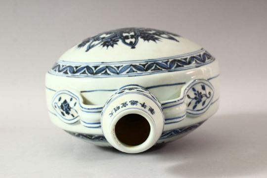 A CHINESE BLUE AND WHITE PORCELAIN TWIN HANDLE MOONFLASK, the body painted with stylised flowers, 31cm high.