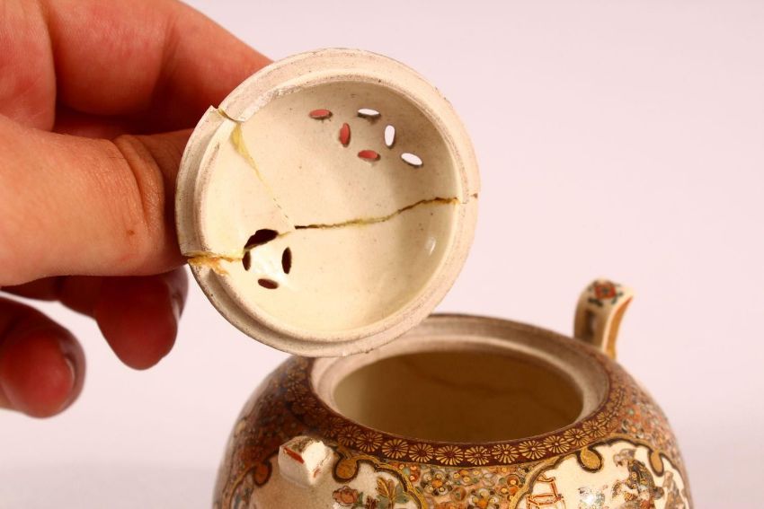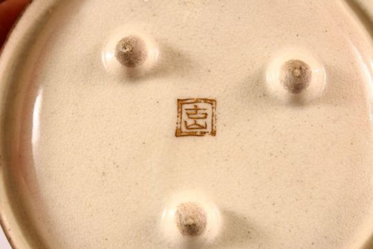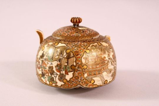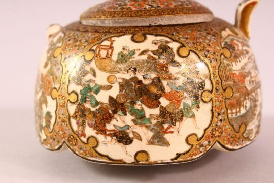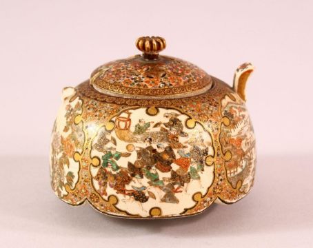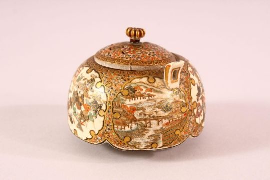 A JAPANESE MEIJI PERIOD SATSUMA KORO & COVER - the body of the koro with panel decoration depicting native landscapes and figures in garden settings, with a ground of the thousand flower style, marked underside( AF)