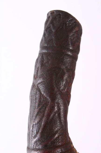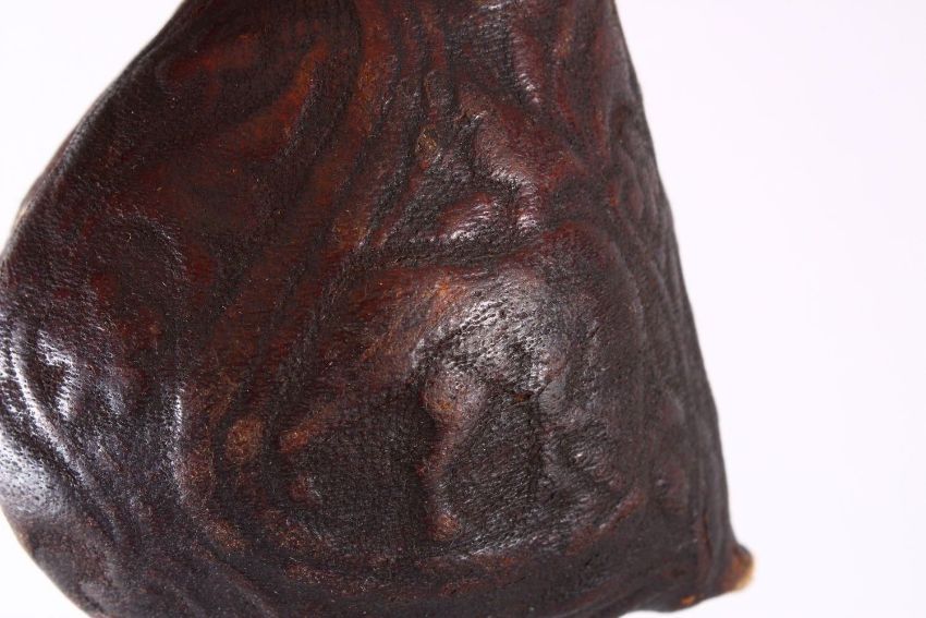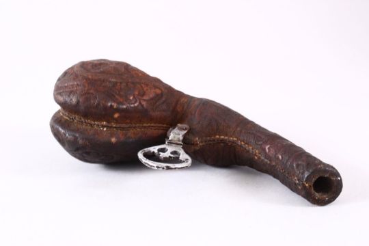A GOOD 19TH CENTURY PERSIAN LEATHER POWDER FLASK, with embossed decoration of animals, 25cm