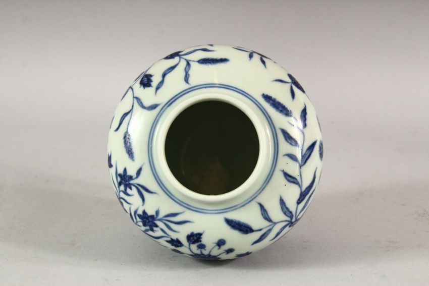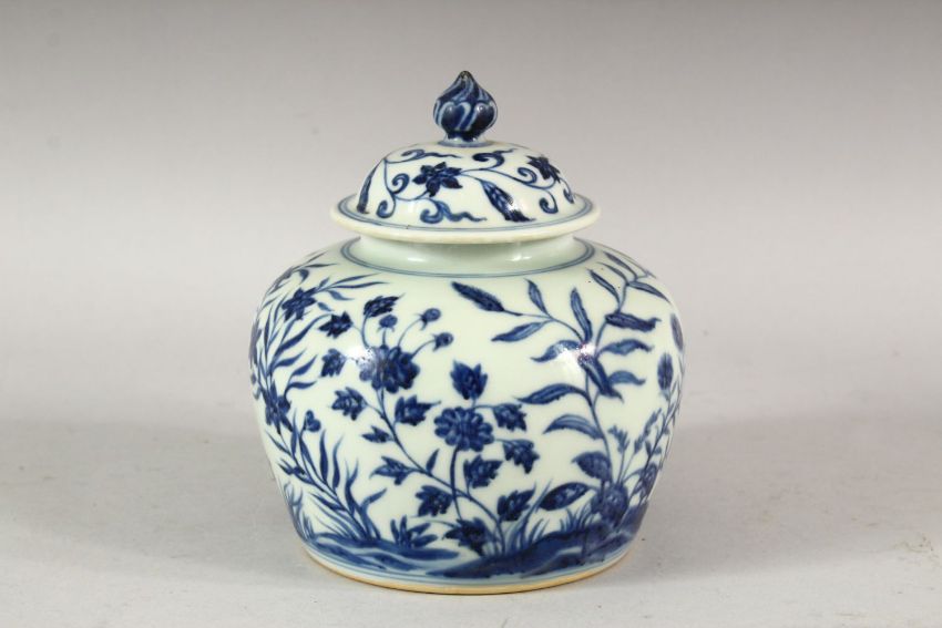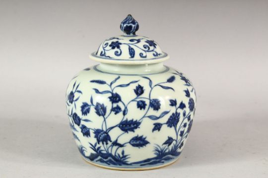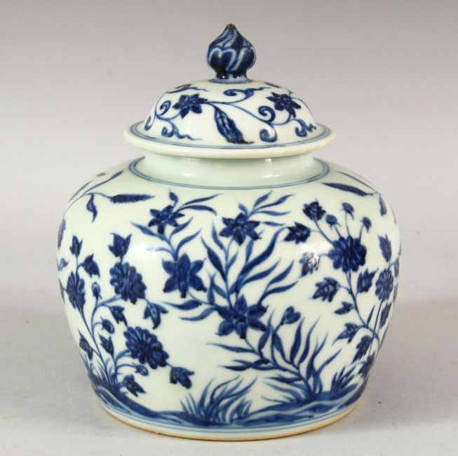 A CHINESE BLUE AND WHITE PORCELAIN JAR AND COVER, the body decorated with floral sprays, overall 15cm high.