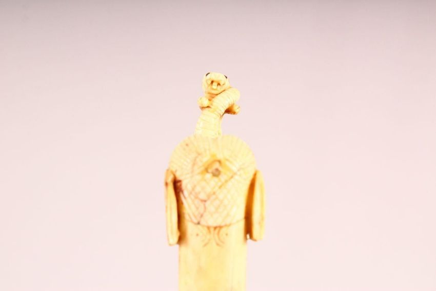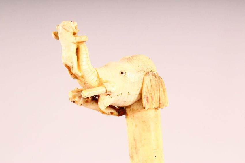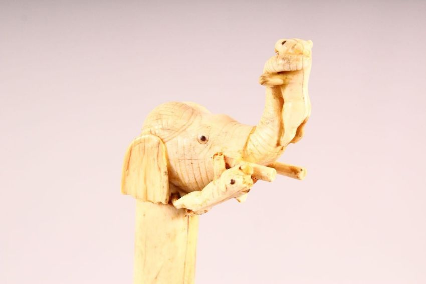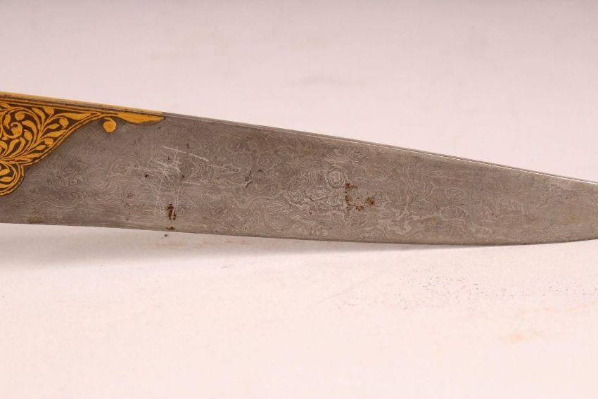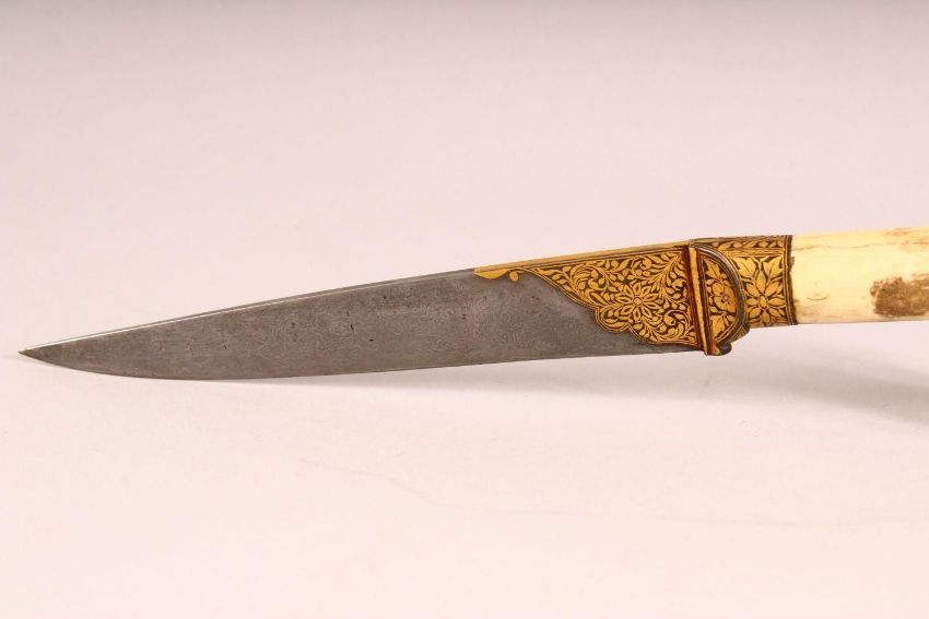 A GOOD INDIAN CARVED BONE & INLAID WATERED STEEL DAGGER, the hilt formed as an elephant from ivory, with inlaid gilt blade decoration, blade with watered steel effect, 33cm